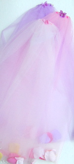 Double Layer Veil with petals and sequins! It is fantastic and unique! It is hard to keep them in stock! Each is filled with petals and sequins in coordinating colors and the beads on the comb are different colors of pink and purple, with a little flower in the middle! Pick your color veil at check out. (Lavender, Pink or Light Pink)