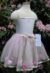 Pretty light pink tutu accented with sage satin ribbons and a little pink rosette at the waist. This tutu is also filled with lots of pretty flower petals!! We use Machine washable, cold water, gentle cycle, line dry. Leotard is not included.