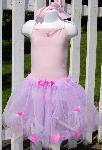 Yards and yards of lavender and white soft tulle! Princess style, beautifully adorned with flowers with bead centers and filled with color coordinated rose petals and pink sequins. It will delight any little girl! Handmade. Leotard not included. One size fits most. Ages 3-6