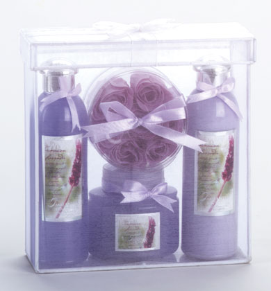 Tasmanian Lavender Bath Set In organza basket. 8 x 3 1/4 x 8 high.